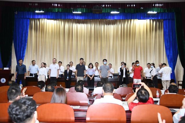 校党委常委、副校长刘仁山带领新进教职工就职宣誓,庄重的誓言回荡在整个报告厅,宣誓完成后由全体校领导为新进教职工代表佩戴校徽,表达了学校对各位新进教职工热烈欢迎。