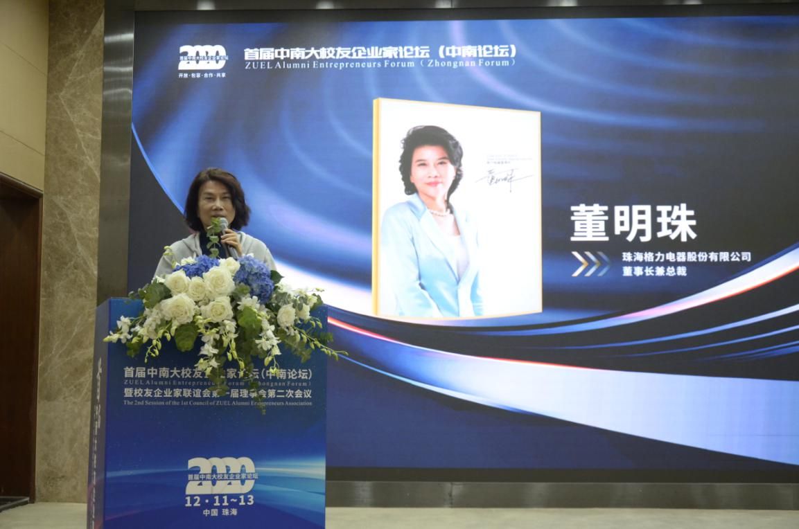 校友企业家联谊会理事长、格力电器董事长董明珠首先发表主题演讲,向与会嘉宾分享了格力电器的发展理念、企业文化和社会担当,期待当代年轻人不忘艰苦奋斗的初心,坚定目标,追求精神财富。在演讲中,董明珠多次提及母校情谊、校友情谊,为学校坚定育人使命、服务国家发展战略点赞。