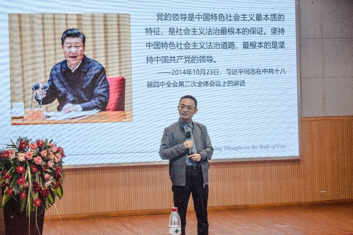 开幕式结束后,徐亚文教授和刘磊老师分别从不同角度,作了关于习近平法治思想的专题讲座。徐亚文教授以《习近平法治思想中关于坚持建设中国特色社会主义法治体系的重要论述》为题,系统讲解了“坚持建设中国特色社会主义法治体系”提出的背景、重要地位及核心要义。刘磊老师以《习近平法治思想中党对法治工作的全面领导 》为题,从习近平法治思想中党领导法治工作的基本原理、党对法治工作全面领导的主要内容、全面从严治党与加强党对法治工作的领导三个方面作出详细阐释。