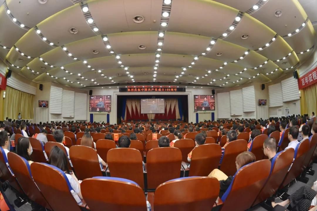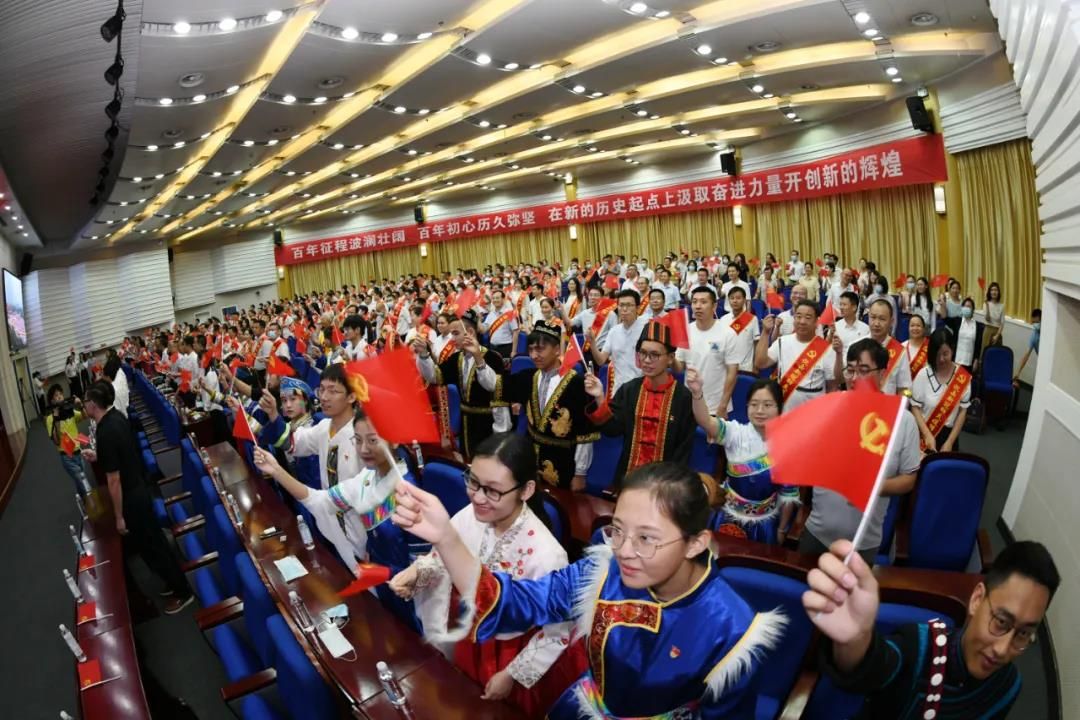 在庆祝大会结束后,全场人员挥舞着手中的党旗,跟随着《歌唱祖国》的音乐,放声歌唱,为伟大的党百岁生日送上祝福。