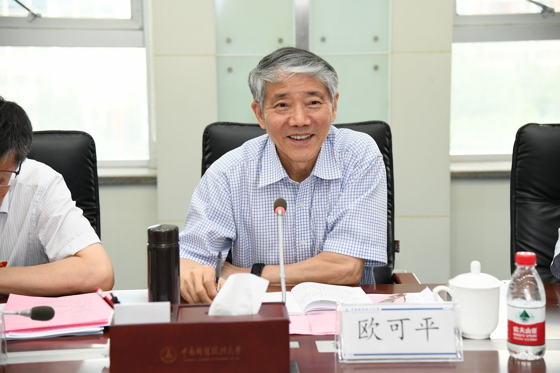 欧可平一行在校党委书记栾永玉,校党委副书记陈明,校党委常委、党委宣传部部长周巍等陪同下,首先来到马克思主义学院,参观“红色中南·党史学科专家手稿展”。一块块展板图文并茂,一件件展品各有故事。欧可平详细了解了我校党史学科发展、党史“三驾马车”的主要贡献,在阅览室仔细观看了党史专家手稿展品。