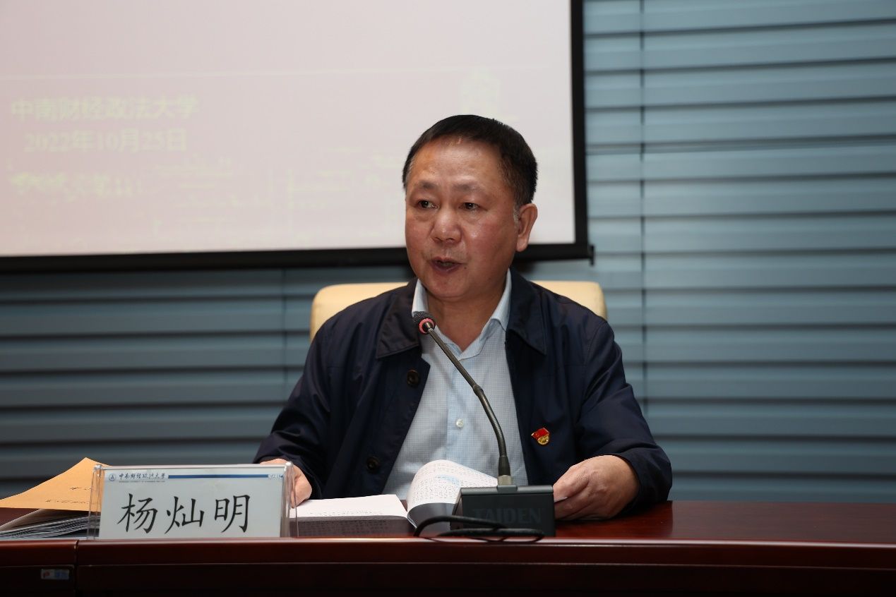 校党委副书记、校长杨灿明传达湖北省传达学习党的二十大精神会议精神。他指出,要贯彻落实湖北省委的要求,把贯彻落实党的二十大精神与贯彻落实习近平总书记关于湖北工作的重要讲话和指示批示精神结合起来,与贯彻落实省第十二次党代会工作部署结合起来,切实把学习宣传贯彻党的二十大精神的实际成效体现到做好全年工作上。