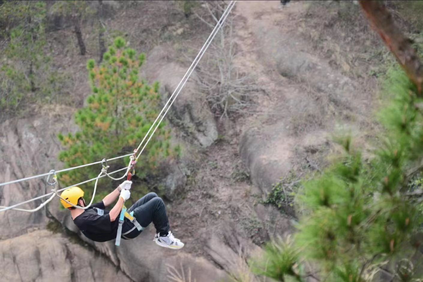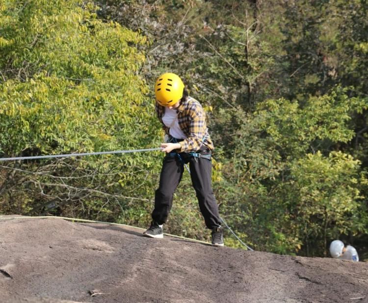 到达实践基地后,同学们按照既定分组展开活动。为了让大家充分将理论与实践相结合,提高户外实践能力,助教老师让每一位同学自行穿戴好护具和装备,经过检查后独立进行岩降和溜索,体验飞檐走壁、风中飞翔的感觉,开启一场充满挑战与惊喜的运动探险。在实践中检验理论,从危机下磨砺意志,培养同学们迎难而上、不畏挑战的精神品质。