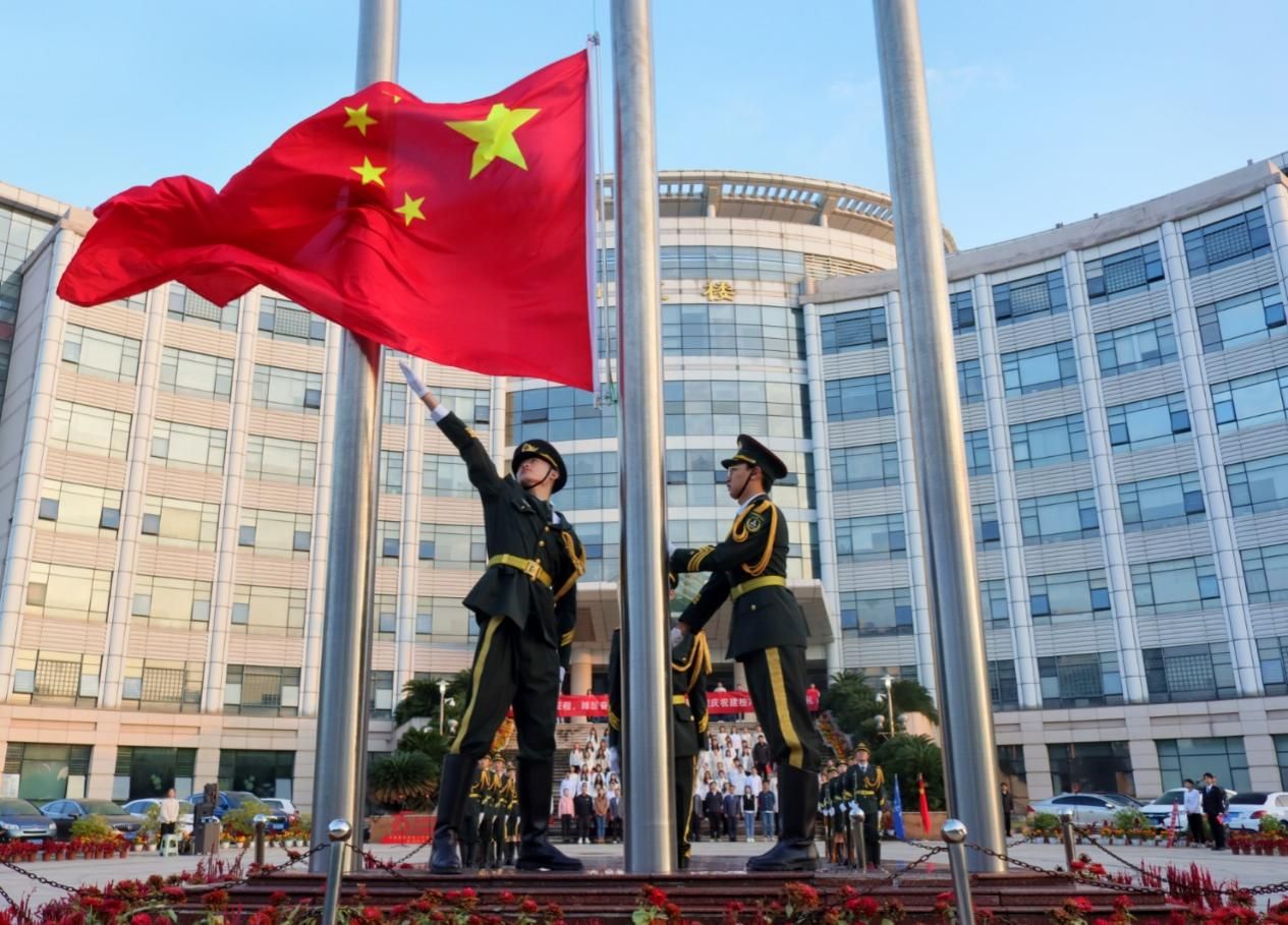 上午7:05,国旗护卫队擎着鲜艳的五星红旗,身着整齐的制服,稳步行进至升旗台。在庄严雄壮的国歌声中,全体师生肃然起敬,一齐奏唱国歌,以昂扬的姿态行注目礼,目光所及之处,鲜艳的五星红旗冉冉升起,迎风飘扬。