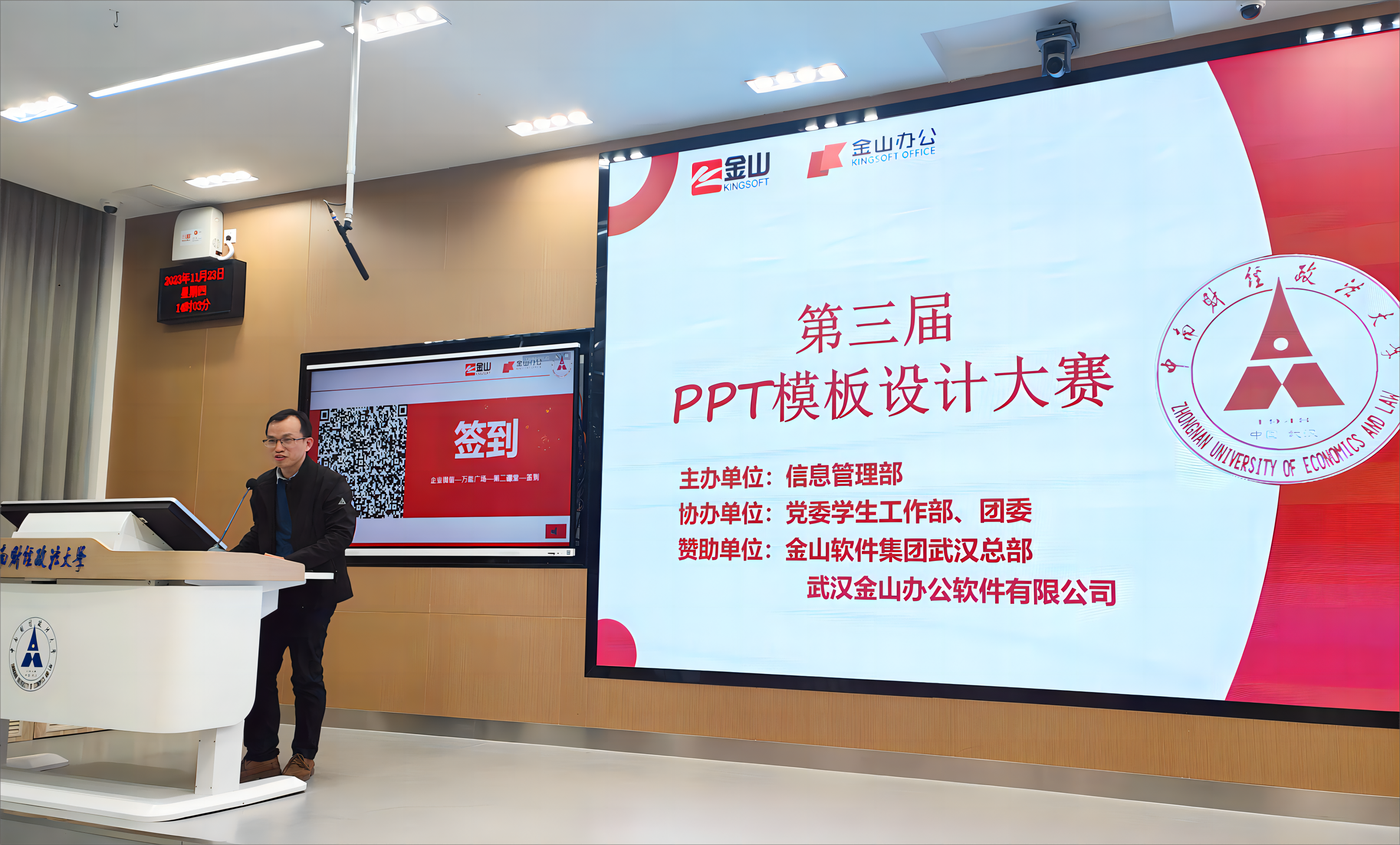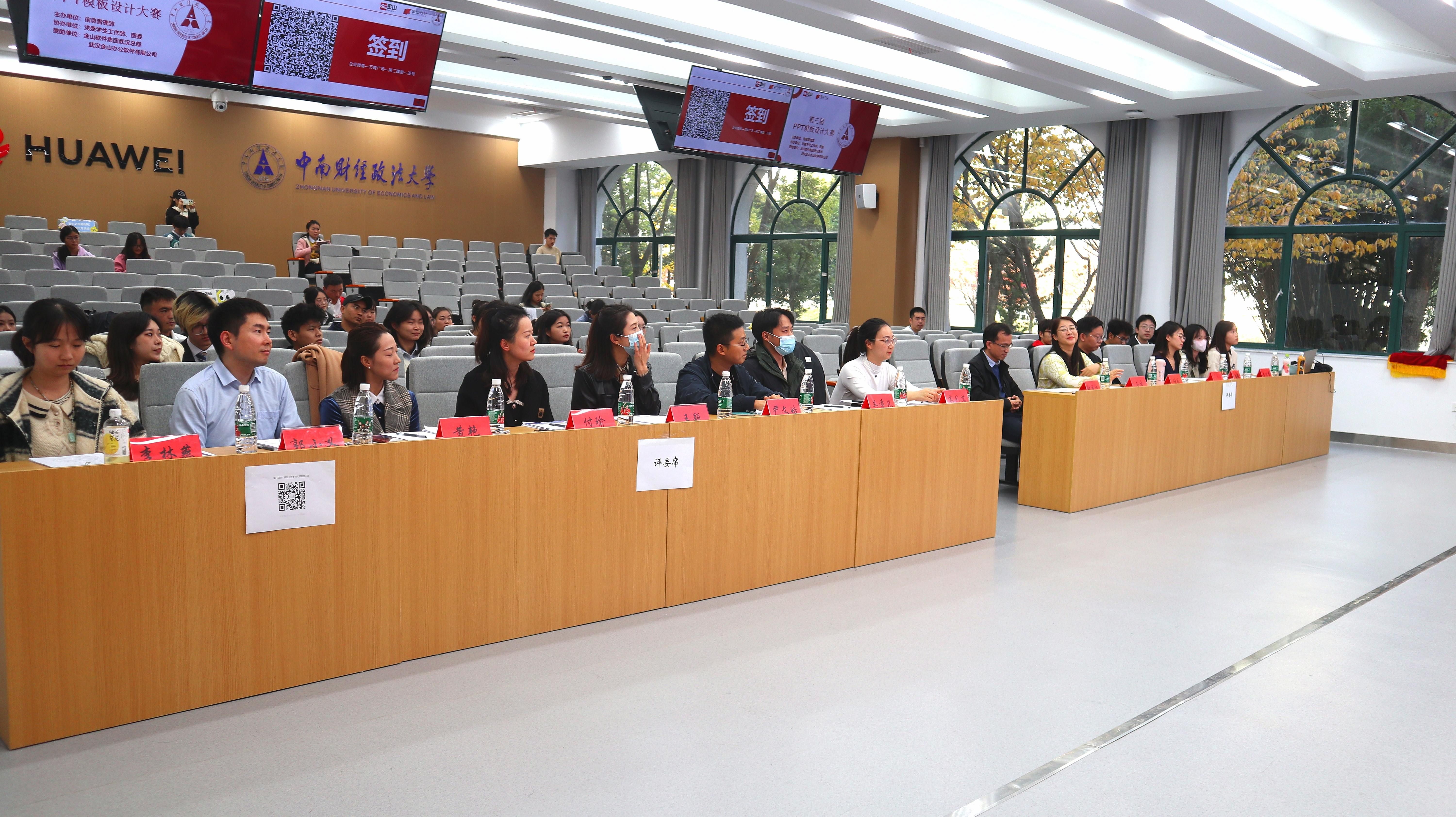 11月23日,决赛在文波112智慧教室举行。金山办公客户成功部总经理储皓、北京金山办公软件华中区销售总监周元晟、党委学生工作部副部长兼学生资助管理中心主任石凌、信息管理部副部长郭翼飞出席本次活动,金山软件教育合作部经理王佳慧、金山办公运营部经理安婧、校工会、妇女办公室主任付瑜、教务部办公室主任王颖、党委学生工作部学习发展中心主任黄艳、信息管理部网络技术中心主任尹文皓、外国语学院团委书记吴章凡、信息管理部正版软件及WPS项目负责人高艺菡、党委学生工作部学习发展中心郭小义、信息管理部信息技术中心李林燕担任评委。