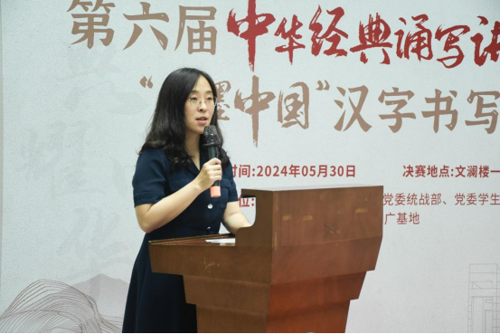 大赛伊始,教务部副部长郝新春致辞。她强调我校深入贯彻习近平总书记关于语言文字教育工作的重要指示精神,高度重视语言文字规范化建设。希望同学们在参赛过程中,不仅要注重汉字书写的技巧,更要注重对汉字内涵的深入挖掘。