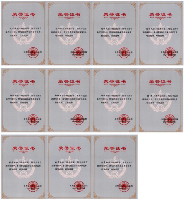 本次实习实训中,刘付成、郝顺兴、刘宇权同学荣获“优秀实习法官助理”称号。刘付成、郝顺兴同学在调研成果、法律文书、典型案例等考核项目中获评三个“优秀”,实现考核项目“全满贯”。项目共邀请了22所高校190名学子参加,其中考核“全满贯”共五位,我校学子成绩斐然独占两席。此外,刘天俣、张婕、张星驰等同学也在部分考核项目中获评优秀等次。