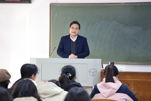 12月11日上午,校党委书记侯振发在文澜楼108教室为法学专业2303、2304班的学生讲授题为“以彻底的自我革命精神全面推进新时代党的建设新的伟大工程”的党史思政课,党委宣传部、教务部等单位负责人,马克思主义学院部分教师现场听课学习。