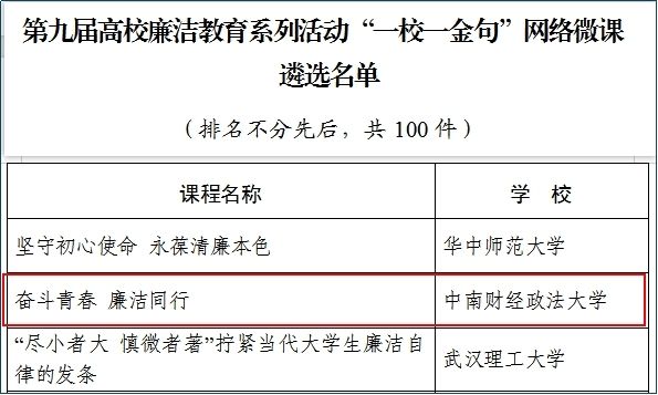 新闻网讯(通讯员 陈俊华 吕卓如)近日,教育部公示了第九届高校廉洁教育系列活动结果,我校两项作品成功入选,取得了在该赛项中的历史最好成绩。其中,纪委办公室、监察工作部,党委宣传部,团委组织拍摄的《奋斗青春 廉洁同行》入选“一校一金句”网络微课遴选名单,并作为优秀作品代表在央视网集中展播。刑事司法学院报送的《汲取传统监察文化筑时代新人廉洁底线》入选课堂实践案例遴选名单。