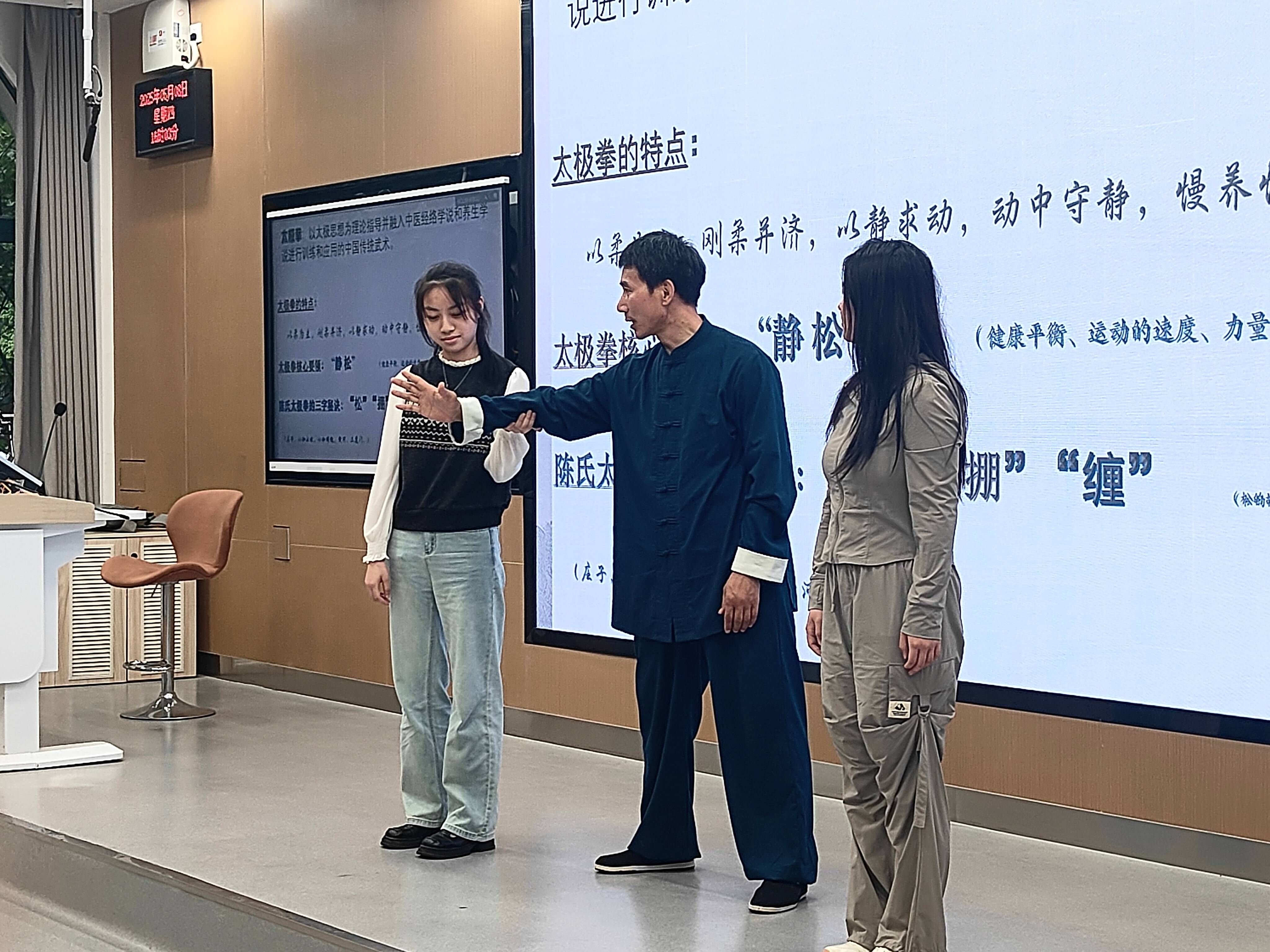 讲座中,陈院长从太极拳的本质定义切入,详细梳理太极拳发展过程中的关键节点与重要流派,将太极拳的前世今生清晰呈现。此外,他指出,“以柔为主,刚柔并济”是太极拳的显著特点。柔时,动作如行云流水、连绵不断;刚时,发力如雷霆万钧、迅猛刚烈。在解析“刚柔相济”的武学密码时,他以行云流水的招式演绎绵柔之韵,以雷霆万钧的发力彰显阳刚之美,引发现场阵阵惊叹。当谈及“静松”核心要领时,两名同学在院长指导下体验“松而不懈”的动作要领,现场响起会心的笑声。“太极不仅是武术,更是动态冥想”的感悟,在同学们心中引发强烈共鸣。
