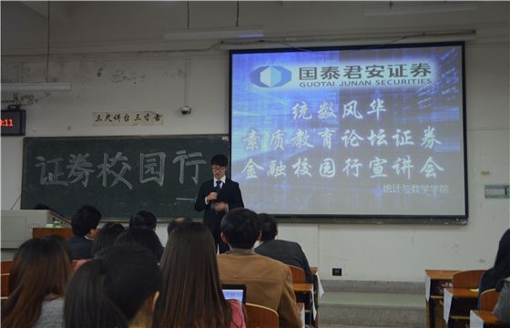 2016年3月25日晚上7点,我院“统数风华”素质教育论坛第八讲之“证券金融校园行”活动在文澜楼210教室开展。本次宣讲会由国泰君安证券公司和我院联合举办,由国泰君安证券湖北分公司经纪业务部总经理兼国泰君安证券公司武汉洞庭街营业部熊东平总经理主讲。莅临本次活动的嘉宾有国泰君安证券京汉大道营业部总经理周春燕女士、统计与数学学院博士生导师李占风教授、学生办公室主任方旭峰老师、分团委书记胡�老师、2014级辅导员胡瑶老师。