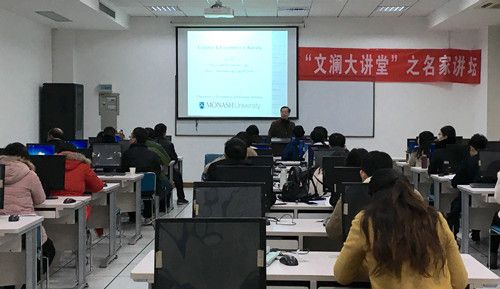 高教授围绕两个主题展开了讲坛。第一个主题是“Economics and Econometrics in Australia”。高教授首先向在场师生简述经济学这门学科的构成,它包括经济学理论、应用经济学和计量经济学。接着,高教授介绍了计量的概念,他指出计量与统计是有本质性的差别的,统计学是一级学科,它由许多二级学科构成,具体包括商业与经济统计、环境统计、金融统计、医学与生物统计和社会统计等,而计量经济学则是属于经济学这个一级学科下的二级学科。统计学与计量经济学虽然有许多相似的方法和模型,但是计量方法和模型是以经济学理论为支撑,运用经济数据解决经济问题为目的,它是统计与数学这两个学科在经济领域中的具体应用,与通过数据分析推断总体未来趋势的统计学有显著差异。高教授接下来讲了计量经济学的主要应用领域,包括金融计量、大数据计量等。金融计量是指金融数据在计量方面的应用,这些金融数据主要有分享收益数据、高频数据和实际利率数据;大数据计量是指在大数据这一主题背景下的计量应用,这些主题包括神经网络、机器学习、商业分析以及社会网络等。最后,高教授介绍了目前澳大利亚各高校在这一领域的研究主题和方向,其中有贝叶斯计算与估计、非线性与非平稳时间序列、非线性变量与面板数据模型和截面数据独立性的检验等。
