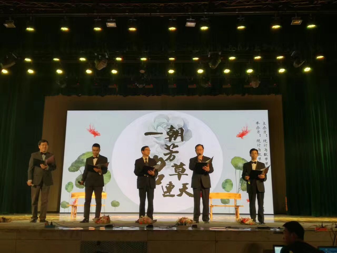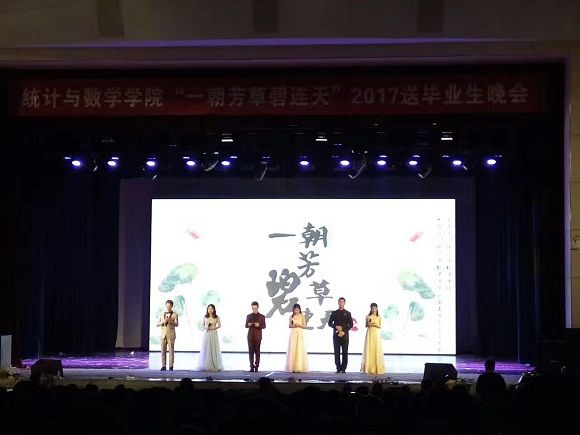 (学生记者柯达 刘璇 周琦琳)2017年4月26日晚7点,统计与数学学院“统数风华”之“一朝芳草碧连天”第六届送毕业生晚会在我校南湖会堂顺利举行。校团委梁娜副书记、统计与数学学院党委书记林际福书记、副院长常金华教授、党委王建荣副书记、副院长杨青龙副教授、院长助理李占风教授以及统计学系主任王艳清副教授、向书坚教授;数理与金融统计学系系主任蒋锋副教授、副主任周友洲副教授、宁瀚文副教授;数学与数量经济学系副主任陈永伟副教授;党政办主任刘伟老师、学生工作办公室主任方旭峰老师、分团委书记胡�老师、2014级辅导员胡瑶老师以出席了本次晚会。张虎院长因公出差虽未能到场,却也给2017届毕业生送来了祝福。