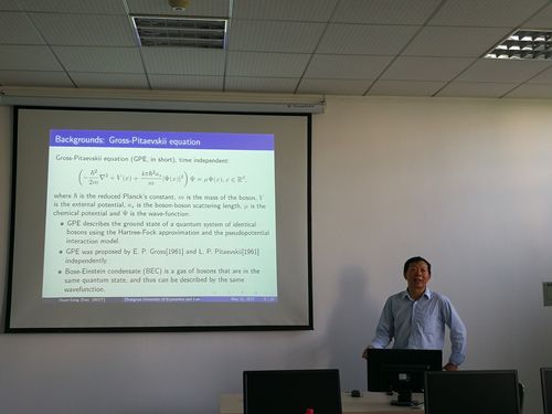 周焕松研究员讲座的主题是“Blow up solutions for a time independent Gross-Pitaevskii equation with ring-shaped potential”。周研究员首先为在场师生介绍了GPE(Gross-Pitaevskii equation),即化学势与波函数之积是简化普朗克常数、外部潜力函数、玻色子质量与散射长度的函数,GPE描述了在时间无关的前提下,运用Hartree-Fock近似和赝势交互作用模型构建的相同玻色子所对应的基态量子系统。周研究员认为,玻色-爱因斯坦凝聚(BEC)是玻色子在冷却到极低温度时宏观数量的粒子占据最低能态时所展现的量子现象,由于此时玻色子处于同一量子态,因此可以由相同的波函数描述。紧接着,周研究员向大家展示如何简化GPE,主要方法是构造耦合常数g,研究中只考虑具有吸引所用的BEC基态(g小于0时的情况),此时研究的重点就变为简化普朗克常数与玻色子质量的相关性问题。周研究员以GP方程与Euler-Lagrange方程的关系作为切入点,运用约束算法与泛函分析的相关知识,经过一系列理论推导,最终得出结论。尽管同学们对于这一领域不甚了解,但在周研究员的悉心讲解下,大家都表示受益良多。