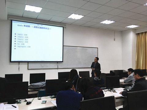 金林老师给大家讲课的内容是R软件中apply函数的应用。金林老师讲解了apply系列函数在R软件中的应用范围、书写格式和优点,并在课堂上用R软件一边操作一边讲解。在tapply函数教学中,以班级中不同专业学生的平均成绩为例,生动形象地说明了tapply函数与apply函数应用范围的不同。