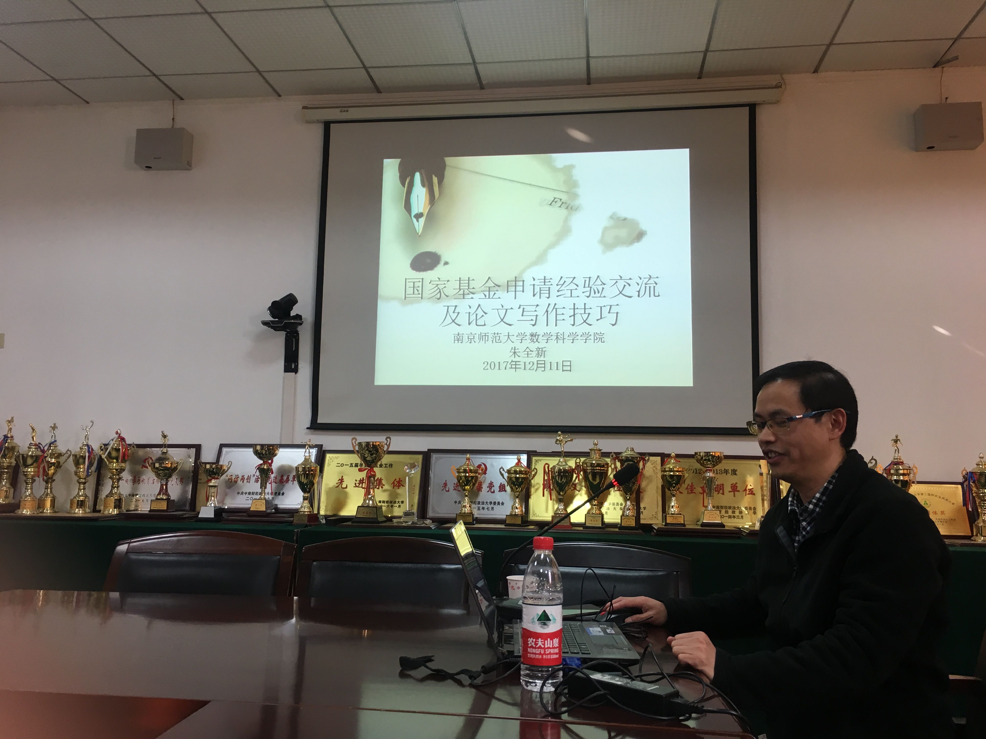 12月11日下午,应我校统计与数学学院邀请,南京师范大学教授、德国洪堡基金高访学者朱全新教授在文波楼四楼会议室作了题为“国家自然科学基金申请经验交流及论文写作技巧”的学术报告。徐映梅教授及部分教师、研究生参加了此次学术报告,报告由蒋峰副教授主持。