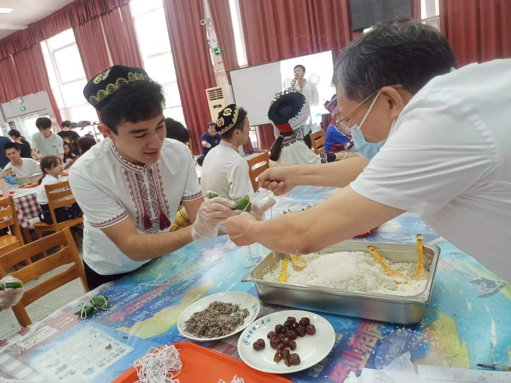 在表演环节中,预科的同学们为大家带来了深情温暖的《天籁之歌》、热情欢快的舞蹈《新疆是个好地方》,唐嘉祥同学带来的《我和我的祖国》将活动推向高潮。活动现场的老师和同学欣赏文艺节目的同时,也品尝到了刚刚亲手包好的蜜粽。
