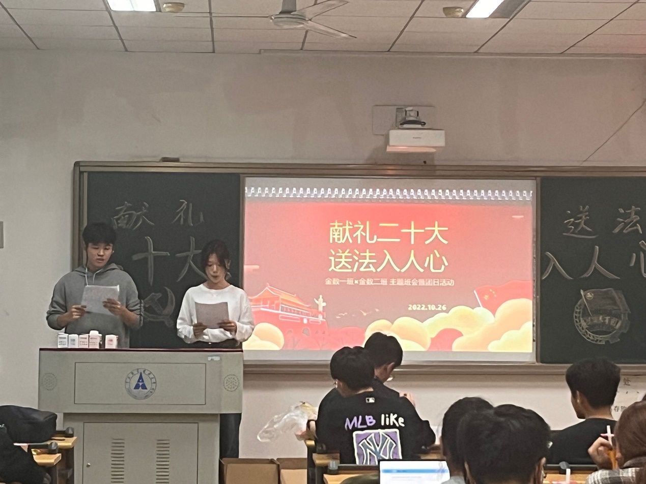 活动第一项,二十大理论宣讲。由金数一班班长胡瑛和金数二班班长汤乐扬共同主持。乐看今秋盈硕果,普天同庆沐春风。两位班长主持班会过程幽默、风趣,以生动的表达方式向大家详细介绍了会议的重要内容。在讲解过程中,在座的同学都全神贯注,努力将报告精神内化于心、外化于行,誓在新的历史起点上努力有新作为。随后,两位班长合唱歌曲《宪法伴我们成长》作为彩蛋,会场的气氛达到第一个高潮。