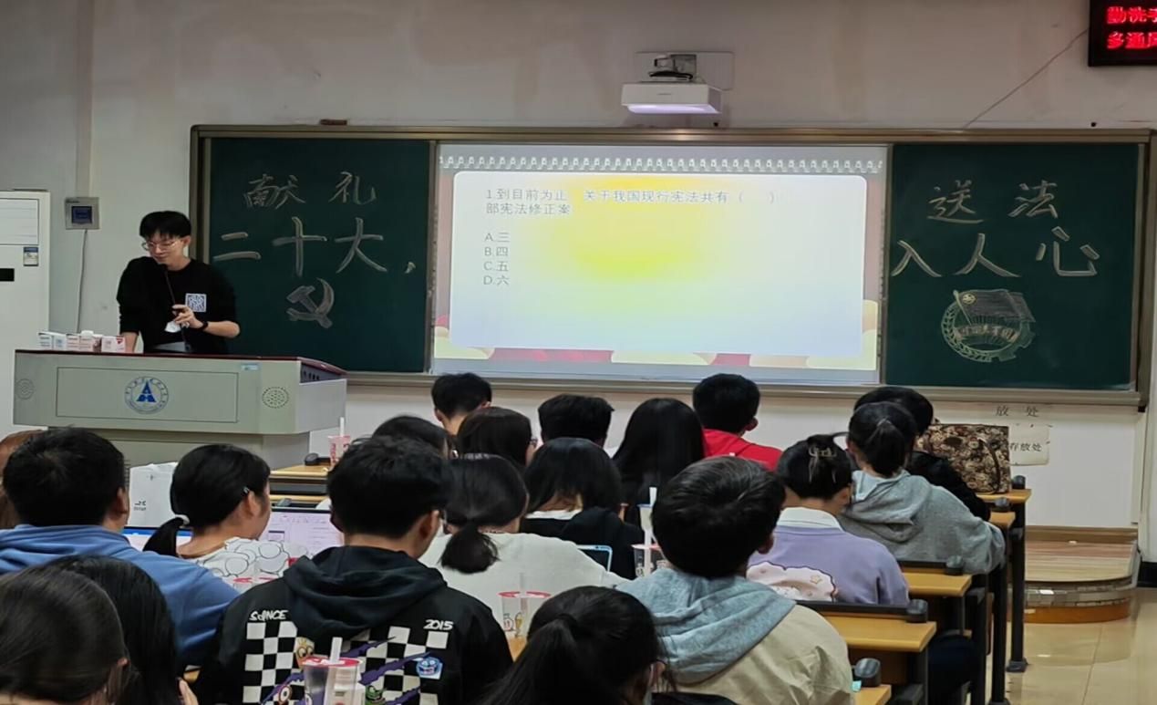 金数一班团支书覃晔承接上部分的内容,在同学们对宪法知识学习情绪高涨之时,开展宪法知识问答互动游戏,旨在让同学们通过抢答问题,进一步牢记宪法知识。所选题目围绕宪法的部分重要内容,宪法在我们生活中的知指导规范作用,宪法的重要地位等,活动过程中,同学们积极举手抢答,主持人在讲解中继续给同学们科普宪法知识,适时活跃现场氛围,整个环节会场气氛活跃、融洽,同学们沉浸在宪法知识的海洋中。