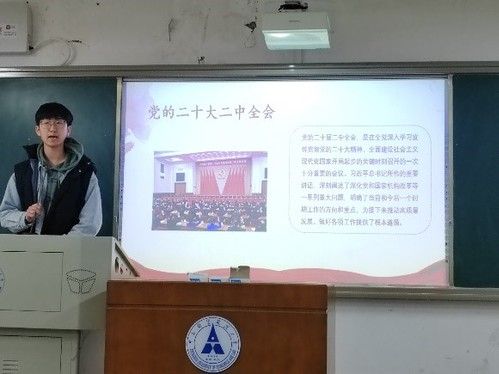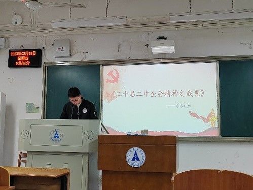 紧接着,由两位主讲同学依次上台分享对二十大精神的理解和见解。首先上台的是司马文杰同学,他分享的主题是“二十届二中全会精神之我见”。他以此次会议的意义作为开头向我们分享他学习党的二十届二中全会公报后的体会和感悟,他谈到:“对于我个人来说,学习党的二十届二中全会公报,让我更加深刻地认识到了中国特色社会主义的重要性和我们党的领导地位,让我更加深刻地认识到了爱国主义、社会主义核心价值观等重要理念的意义,也让我更加坚定了对于中国特色社会主义是实现中华民族伟大复兴的必由之路的信心和支持。”