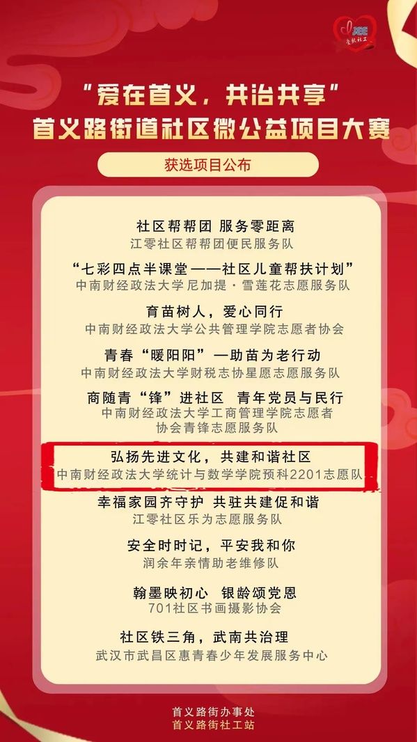 4月18日上午,首义路街社工站依托省级支持志愿服务创新试点项目开展了“爱在首义,共治共享”社区微公益项目大赛路演。米兰电竞·(中国区)统计与数学学院预科2201志愿队开展的“弘扬先进文化,共建和谐社区”活动入选“爱在首义,共治共享”社区十大微公益项目,这是居民及社区对预科2201志愿队志愿工作的肯定,预科2201志愿队伍中的每一名优秀志愿者都是平平凡凡、朴实无华的中南大学子,他们的不同在于他们始终坚持地做着他们觉得应该做的事:奉献自我,回报社会,希望自己能为世界带来一点小小的不同,给社会送来一丝温暖。在今后的志愿工作中,预科2201志愿队将继续弘扬“奉献、友爱、互助、进步”志愿精神,提高参与度,让争当优秀志愿者成为一种良好的社会意识,使校园形成友爱互助的氛围,增加居民的幸福感,促进社区和谐稳定。