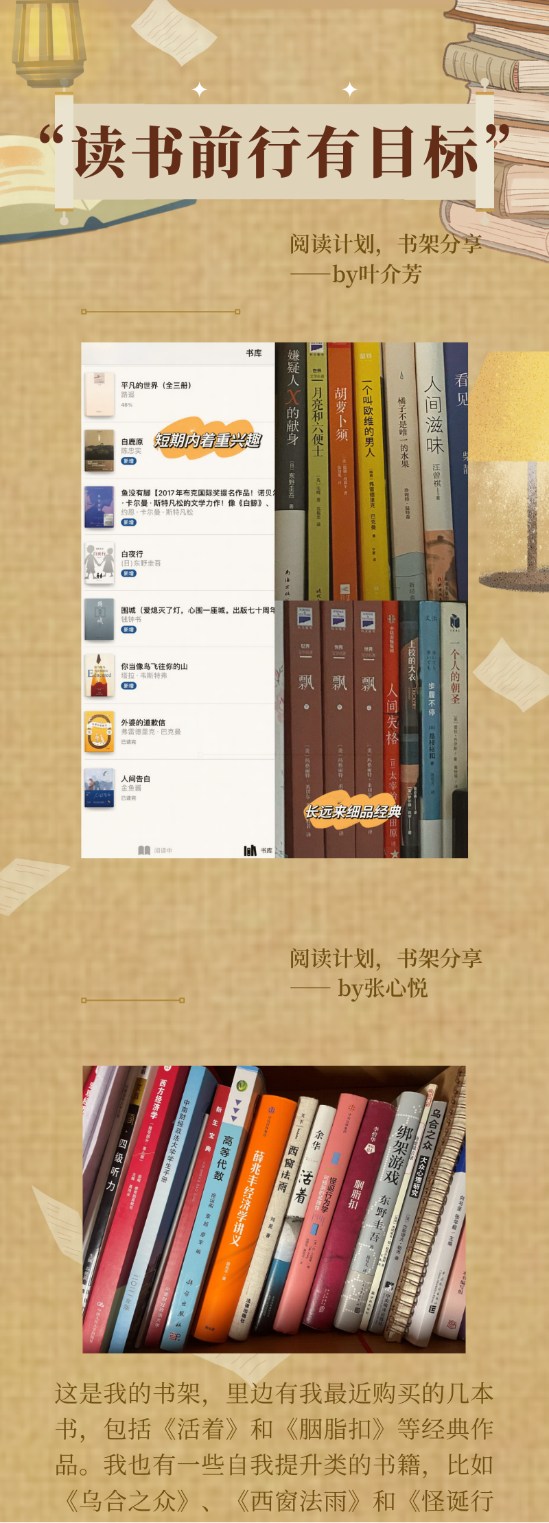 其次是“好读书,前行有目标”,叶介芳同学和张心悦同学分别向我们展示了她们的小书架和阅读计划,激发了同学之间分享和交流阅读计划的积极性。