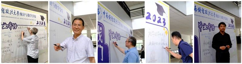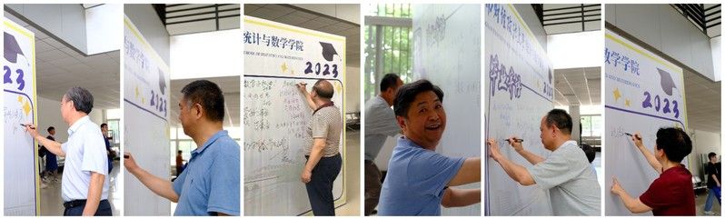 “赠人以言,重于金石珠玉”,答辩结束后老师和毕业生们纷纷写下自己的毕业寄语。“祝统数学子们毕业快乐,前程似锦!”“乘风破浪”“统数总冠军!”,白板上的寄语是大家对过去生活的告别,是对未来前途的憧憬,更是老师们对大家的美好祝福与殷切期望。聚是一团火,散是满天星,祝贺2023届统数学子毕业快乐,前程似锦,来日顶峰再见!