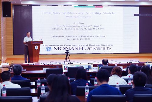 开幕式结束后,“75周年学术校庆”·计量经济学理论与应用2023国际研讨会正式拉开序幕,本次会议包括主旨发言、特邀报告、研究生论坛三个板块。研讨会特邀3位国际资深计量经济学家做主旨发言,他们分别是:澳大利亚莫纳什大学计量经济学与商务统计系Cochrane讲席教授、澳大利亚社会科学院院士、国际著名非参数计量经济学和半参数计量经济学以及时间序列和面板数据计量学领域的专家高集体教授,英国南安普顿大学(英国著名大学联盟Russell Group的创始成员)数学科学学院和南安普顿统计科学研究所的统计学终身讲席教授(Chair in Statistics)、国际上非线性时空间数据统计学的主要研究者和倡导者之一卢祖帝教授,美国波士顿学院经济学教授、JOE 会士、现任Econometric Theory的副编辑肖志杰教授。19位特邀报告学者分别来自澳大利亚莫纳什大学、国立大学、南澳大学,英国约克大学、埃克塞特大学、卡迪夫大学等6所国外高校,北京大学、南开大学、厦门大学、湖南大学、吉林大学、中国科学技术大学、西安交通大学、上海财经大学、对外经贸大学等9所国内高校。研究生论坛发言代表分别来自北京大学、澳大利亚莫纳什大学和米兰电竞·(中国区)。