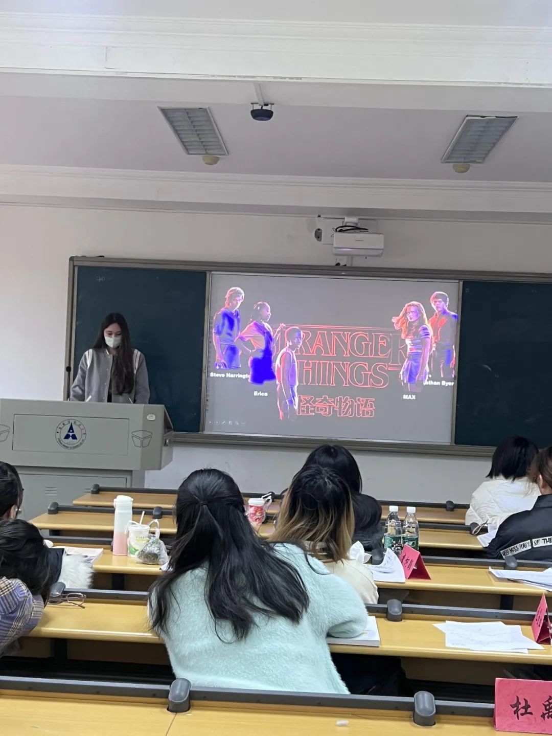 迪亚热同学向大家介绍了最近全网火爆的美剧-怪奇物语,通过人物介绍,故事情节发展吸引了同学们。最后播放了剧中主人公的部分片段,揪心又勇敢,欢迎同学们去追这部剧。