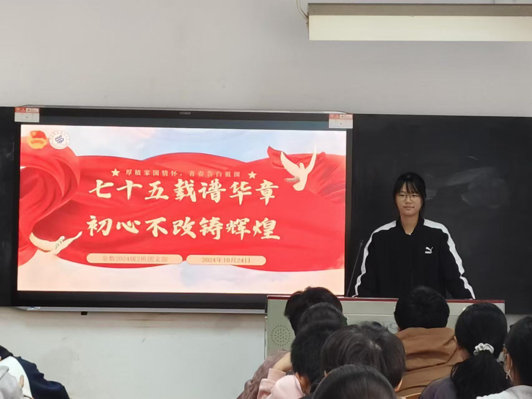 (通讯员:李奕洋 朱垅吟)2024年10月24日,为引导支部团员和青年学习党史、新中国史、改革开放史、社会主义发展史、中华民族发展史,增强广大团员和青年对党和国家的认同感、归属感、自豪感,自觉为强国建设、民族复兴伟业挺膺担当,金数2402团支部以庆祝中华人民共和国成立75周年为契机,积极开展了主题为“七十五载谱华章,初心不改铸辉煌”的党史学习教育团日活动,为祖国母亲送上最诚挚的祝福。