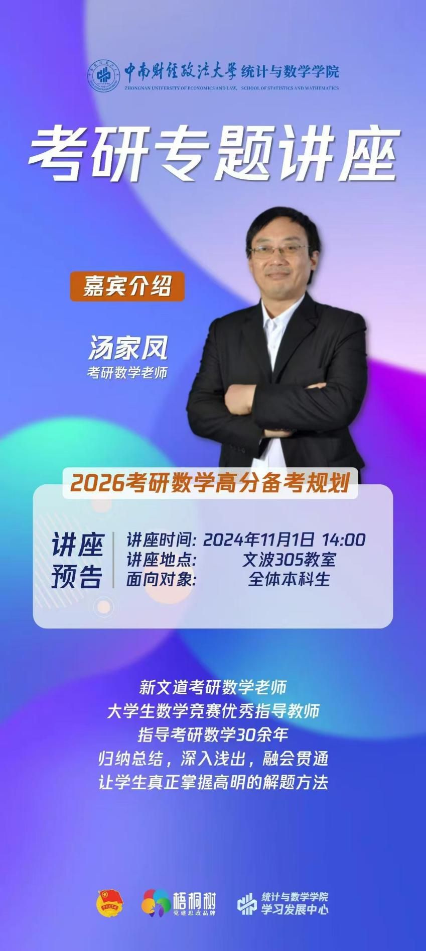 (通讯员:刘嘉音 何丽香)2024年11月1日14时,统计与数学学院考研高分备考规划专题讲座在南湖校区文波楼305成功举行。本次座谈会邀请了汤家凤老师为学子们分享考研数学经验。