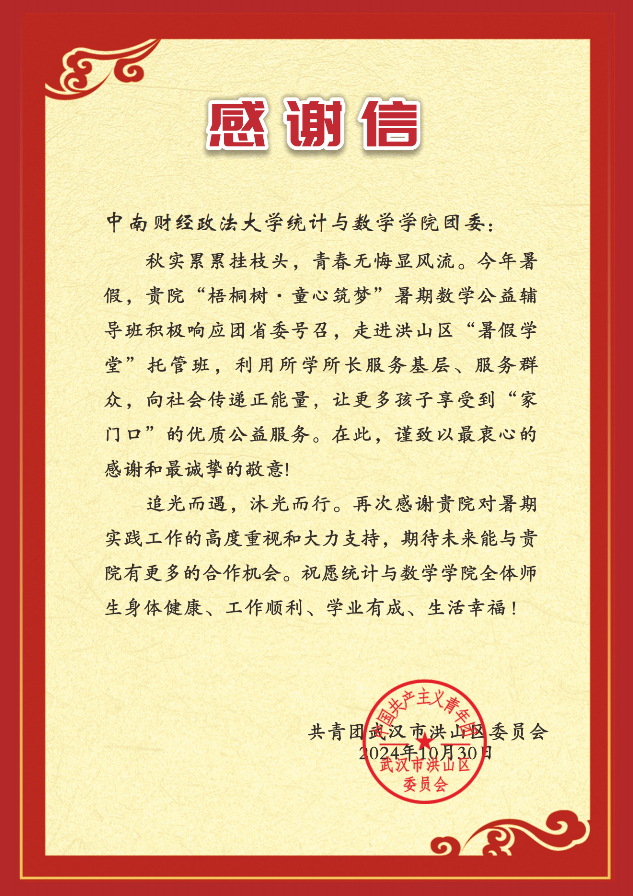 (通讯员:舒鑫才 李嘉佳 段项欣)近日,共青团武汉市洪山区委员会向我院团委发来感谢信,对我院“梧桐树·童心筑梦”暑期数学公益辅导班成效予以肯定,并向我院致以诚挚的感谢与敬意。