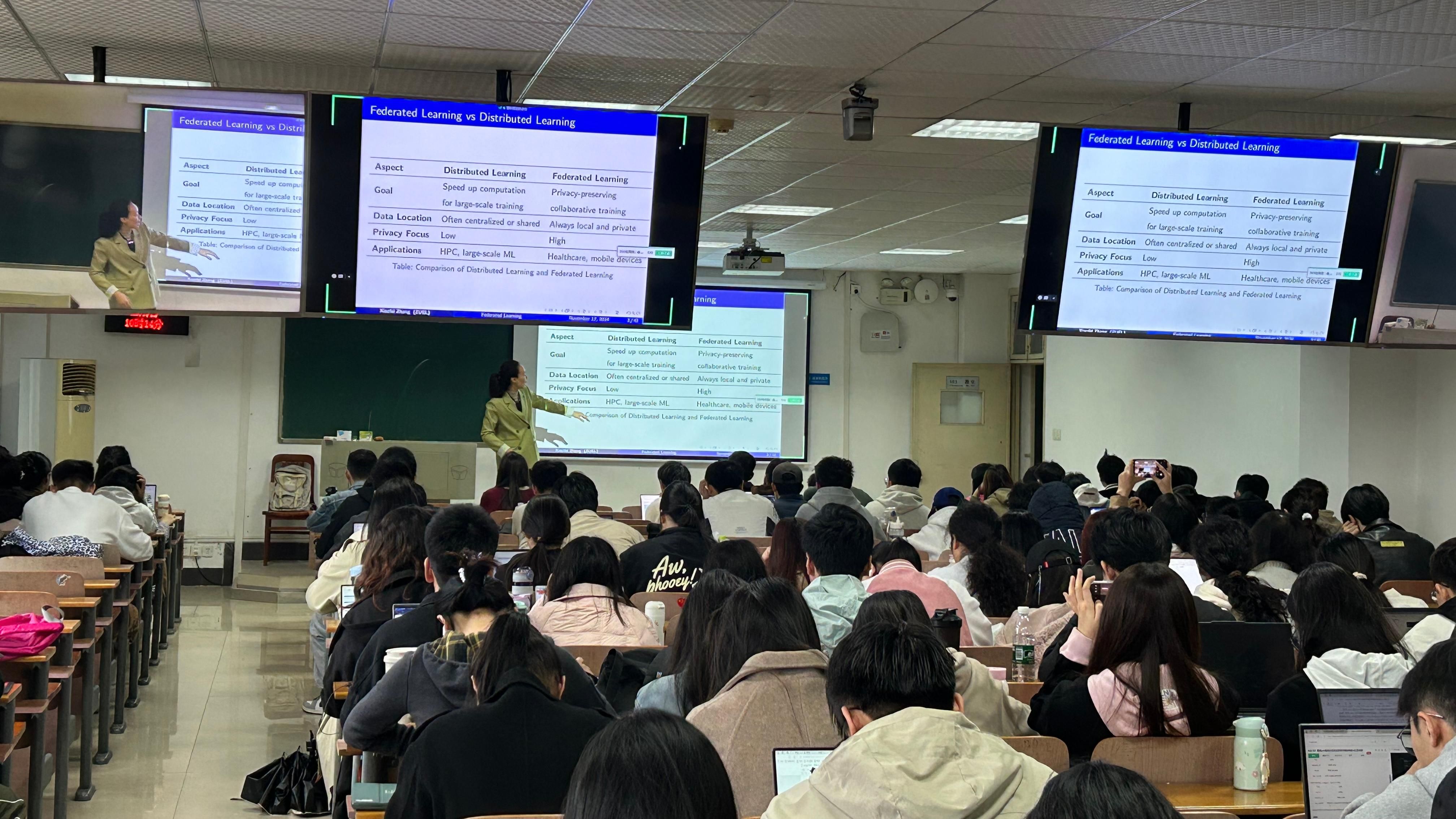 章晓菲老师的讲解深入浅出、生动有趣,赢得了听众的热烈掌声和高度评价。此次讲座不仅深化了同学们对于联邦学习概念的认知,还传授了宝贵的论文撰写技巧,并指明了探索创新点的有效路径,为同学们后续的课题研究工作开辟了全新的思路与灵感源泉。