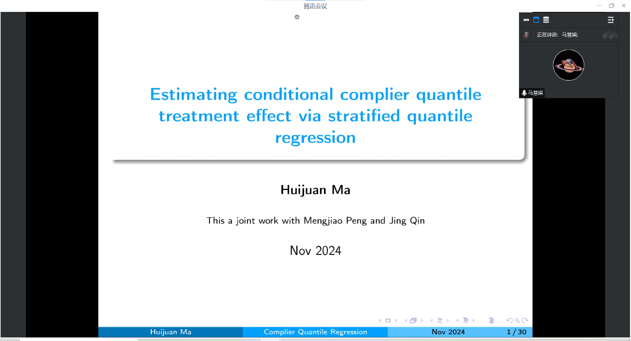 (通讯员 吴志伟 周博文)11月29日10时,统计与数学学院在腾讯会议举办“基于分层分位数回归的条件依从分位数因果效应估计”主题学术讲座,本次讲座由华东师范大学副教授马慧娟主讲,统计与数学学院刘寅老师主持,学院师生积极参与。