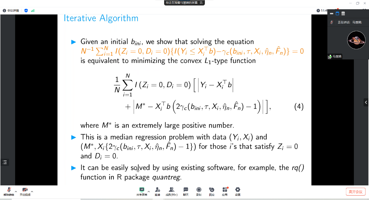 马慧娟副教授在“基于分层分位数回归的条件依从分位数因果效应估计”报告中,提出了一种新的分析框架。该框架利用工具变量(Ⅳ)方法,专注于依从者这一关键子群体,通过分层分位数回归模型研究个体特征与条件依从分位数治疗效应的关系。该模型不仅捕捉治疗与协变量间的相互作用,还包含了传统统一模型作为特例。报告介绍了一种新颖的迭代算法,无需调整参数,直接利用数据混合结构,解决了复杂方程的求解问题,并讨论了估计量的相合性和渐近正态性。通过实例分析和模拟实验,验证了该方法的实际应用价值。