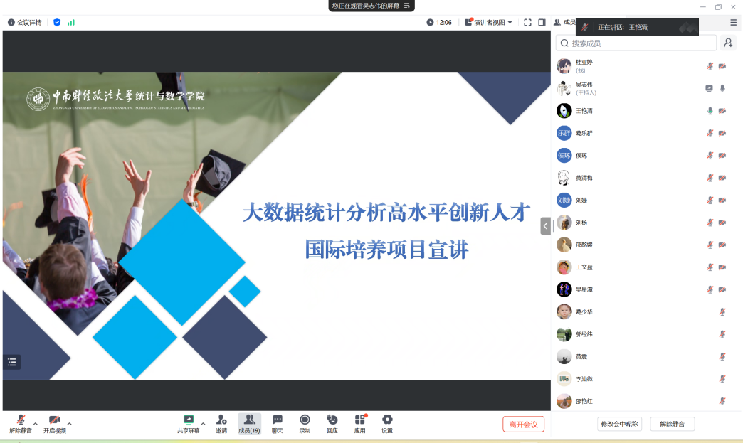 (通讯员 吴志伟 桂亚婷)近日,国家留学基金管理委员会发布《关于确定2025年创新型人才国际合作培养项目资助项目的通知》,统计与数学学院“大数据统计分析高水平创新人才国际培养项目”成功获批。为进一步做好后续的人员选拔推荐工作,1月7日晚,学院线上举办项目宣讲活动。本次宣讲由副院长王艳清主讲,研究生辅导员吴志伟、学院2024级博士研究生参会。