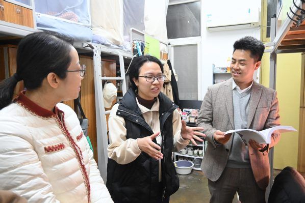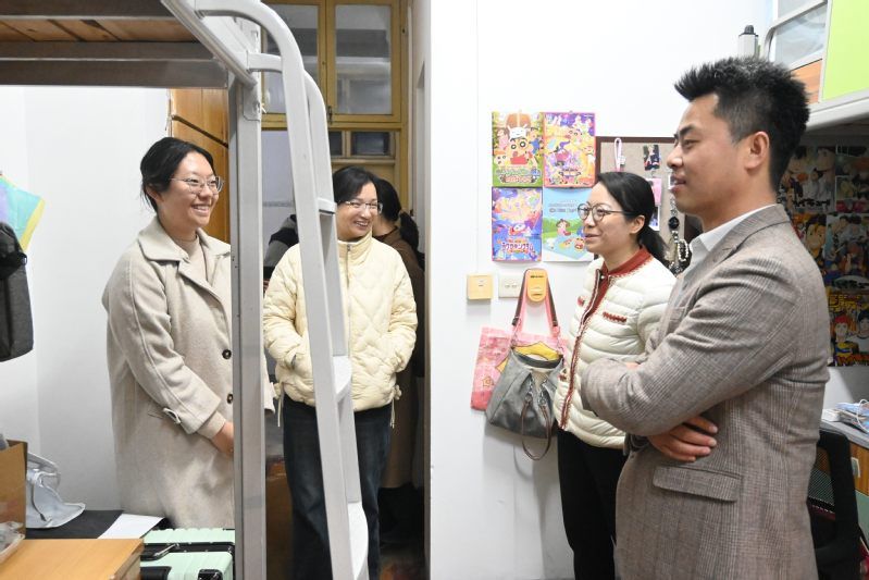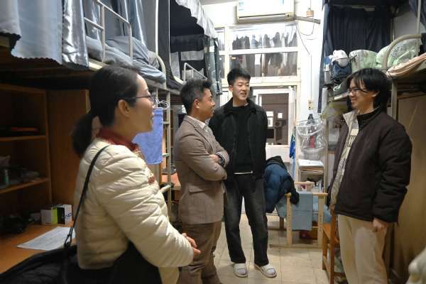 (通讯员 舒鑫才)新学期伊始,为深入了解学生动态,扎实推进优良院风学风与宿舍文化建设,传递学校学院关怀,2月26日晚,统数学院院领导和辅导员一行深入学生宿舍,亲切看望本科生,硕、博士研究生代表,为同学们送去新学期的问候与祝福。此次走访既是落实"三全育人"的重要举措,也是构建"学在统数"优良学风和"美美与共"宿舍文化的生动实践。