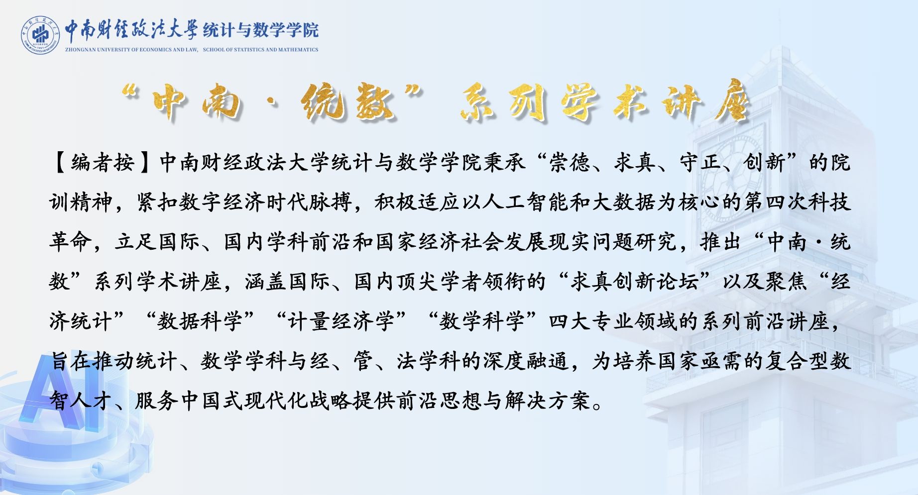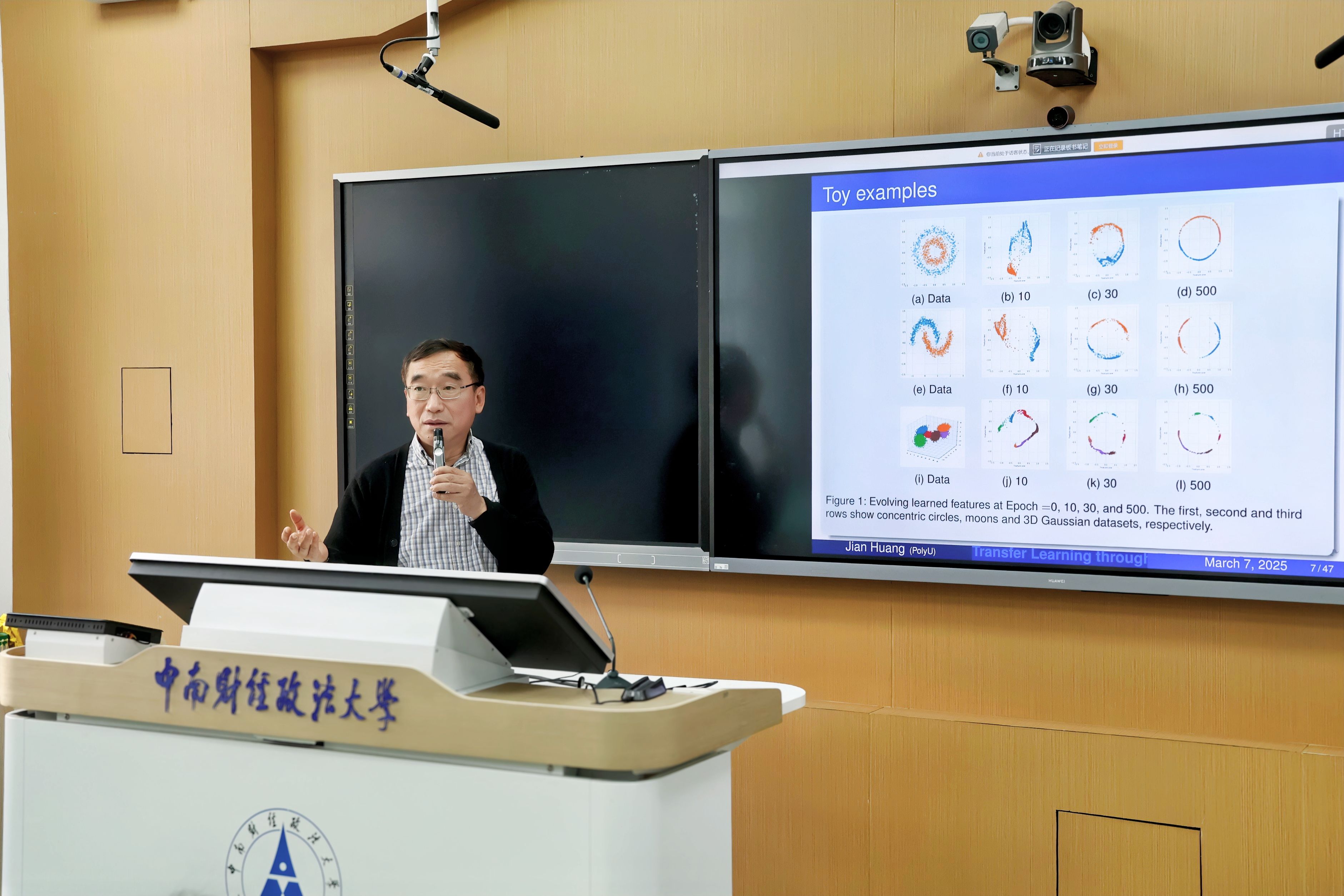 (通讯员 吴志伟 吴佳浩)3月7日下午4时,由统计与数学学院主办的“中南·统数”求真创新论坛(2025年第1期)在文波楼智慧教室205举行。本期论坛特邀香港理工大学讲座教授黄坚担任主讲嘉宾,以“Transfer Learning through Enhanced Sufficient Representation: Enriching Source Domain Knowledge with Target Data”为主题展开前沿学术分享。学院近百名师生齐聚现场,共同探讨数据科学领域的最新研究方法与应用前景。