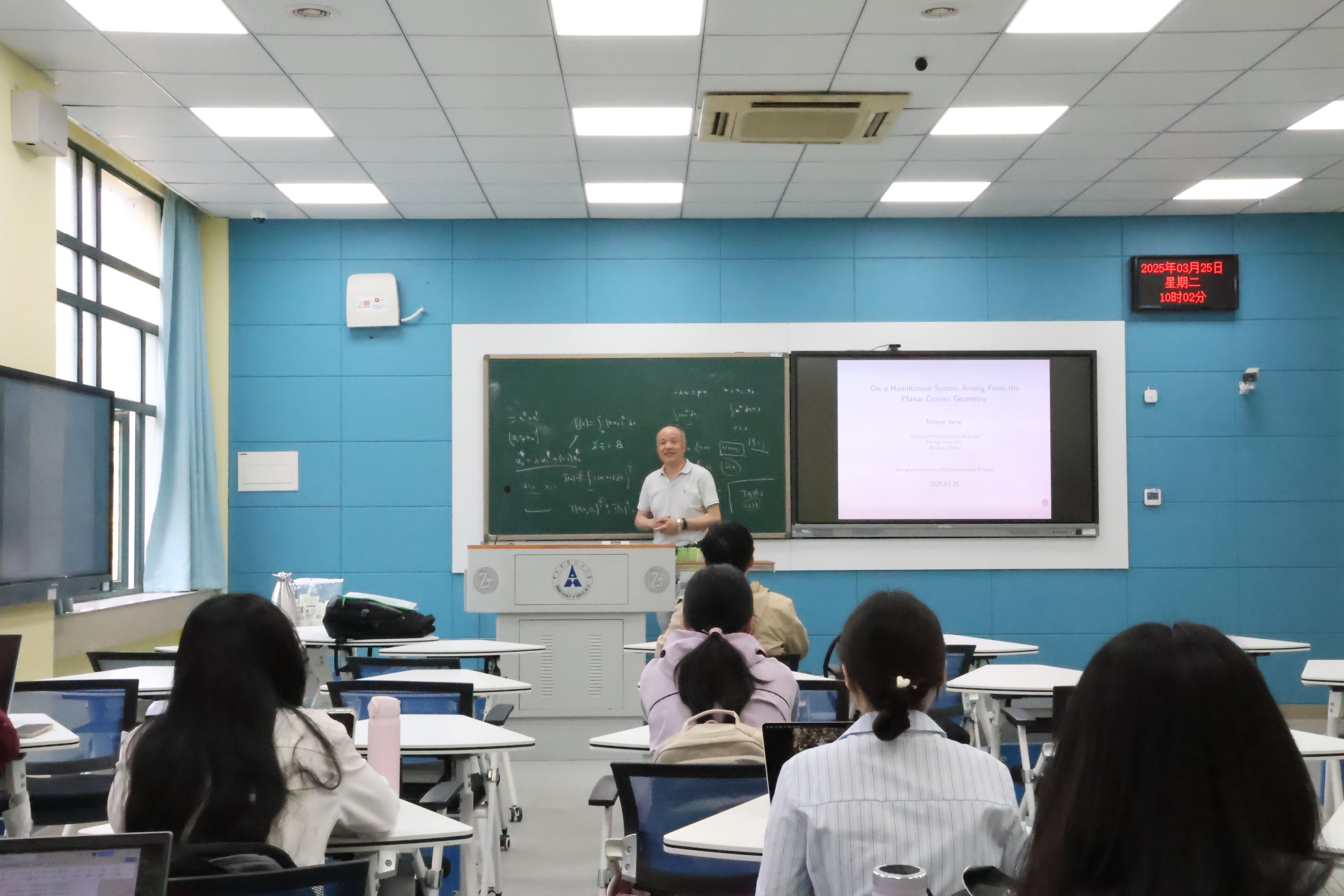 (通讯员 吴志伟 吴佳浩)3月25日上午10时,由统计与数学学院主办的“中南·统数”数学科学系列讲座(2025年第4期)在文波楼201教室举行。本期讲座由北京大学蒋美跃教授担任主讲嘉宾,以“On a Hamiltonian system arising from the planar convex geometry”为主题开展前沿学术分享,统计与数学学院蒋永生教授主持,学院师生积极参与。