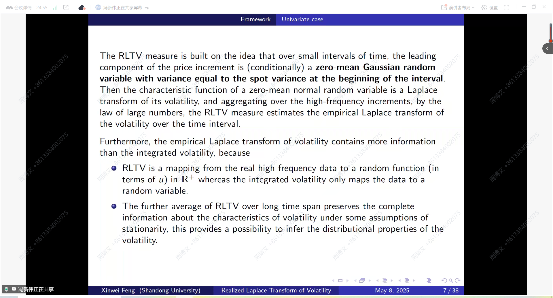 冯教授在报告中探讨了高频数据下经验实现拉普拉斯变换波动率(ERLTV)的渐近尾部行为。对于一维情况,他建立了ERLTV的大偏差原理,定义了大偏差原理在整个实数空间中的优良速率函数,这表明了ERLTV标准化对数尾部概率的极限。此外,他还推导了ERLTV的函数级大偏差和中等偏差原理。对于多变量波动率过程,冯教授建立了中等偏差原理和中心极限定理,适用于非重叠增量和重叠增量的联合拉普拉斯变换波动率。
