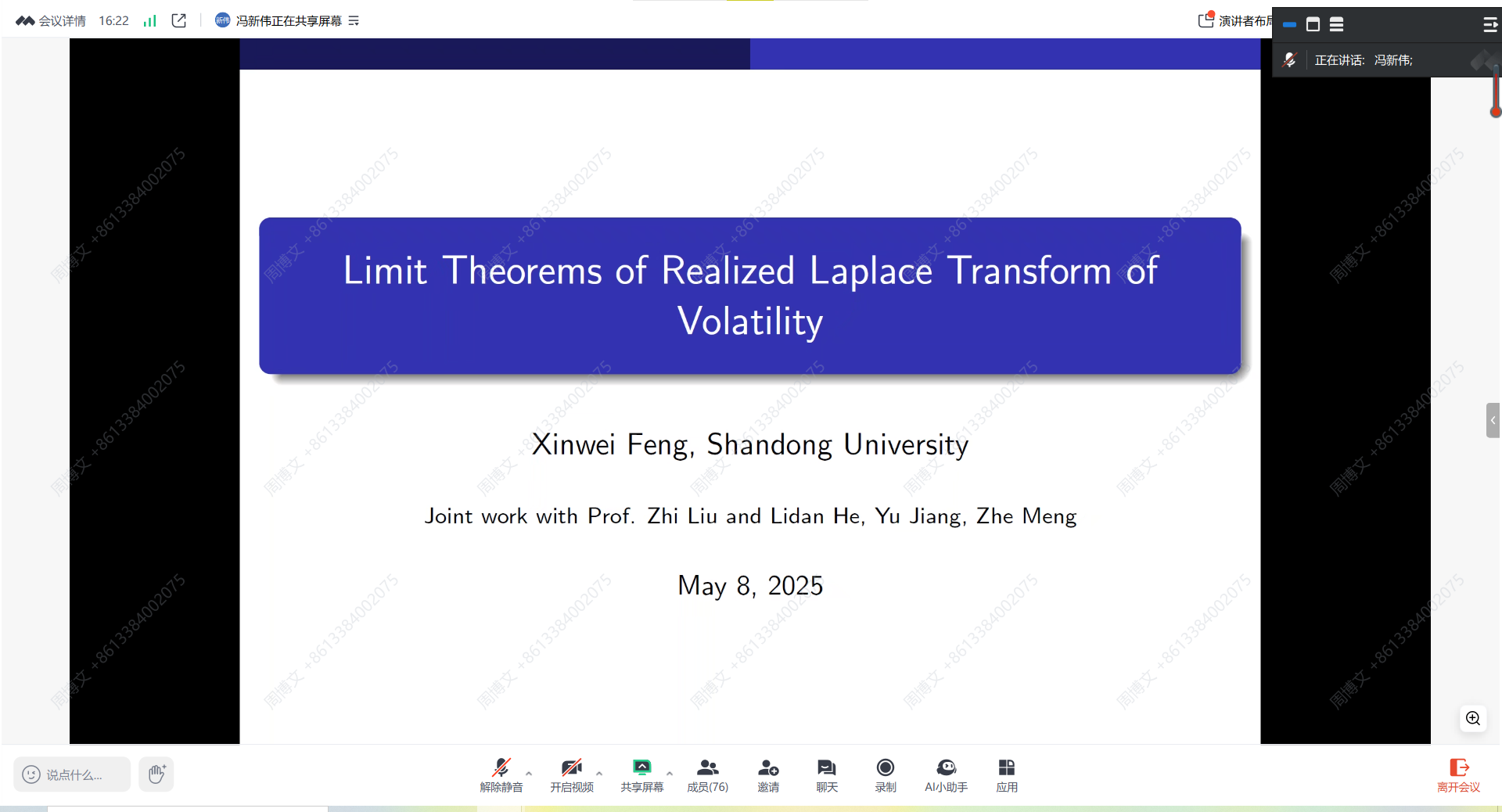 (通讯员 吴志伟 周博文)5月8日,由统计与数学学院主办的“Limit Theorems of Realized Laplace Transform of Volatility”学术讲座在腾讯会议顺利举行,本次交流活动由山东大学冯新伟教授主讲,学院师生积极参加。