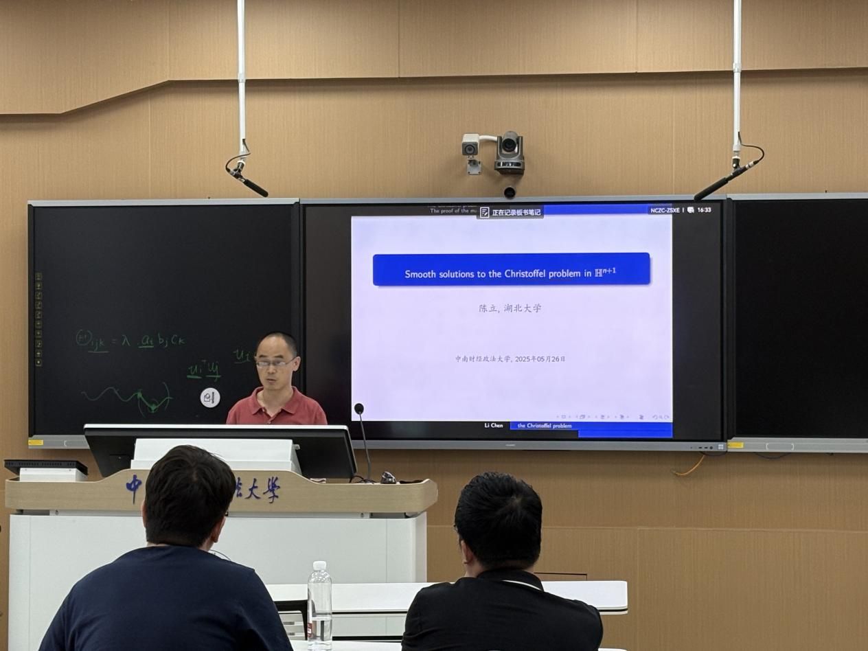 (通讯员 吴志伟 谭哲雨)5月26日下午,由统计与数学学院主办的“中南·统数”数学科学前沿系列讲座(2025年第7期)在文波楼智慧教室205成功举办。湖北大学陈立副教授应邀以“Smooth solutions to the Christoffel problem in hyperbolic space”为题开展前沿学术分享。本期讲座由统计与数学学院蒋永生教授主持,学院师生积极参与。