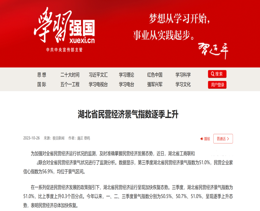 团队编制的季度湖北省民营经济景气指数获学习强国刊载