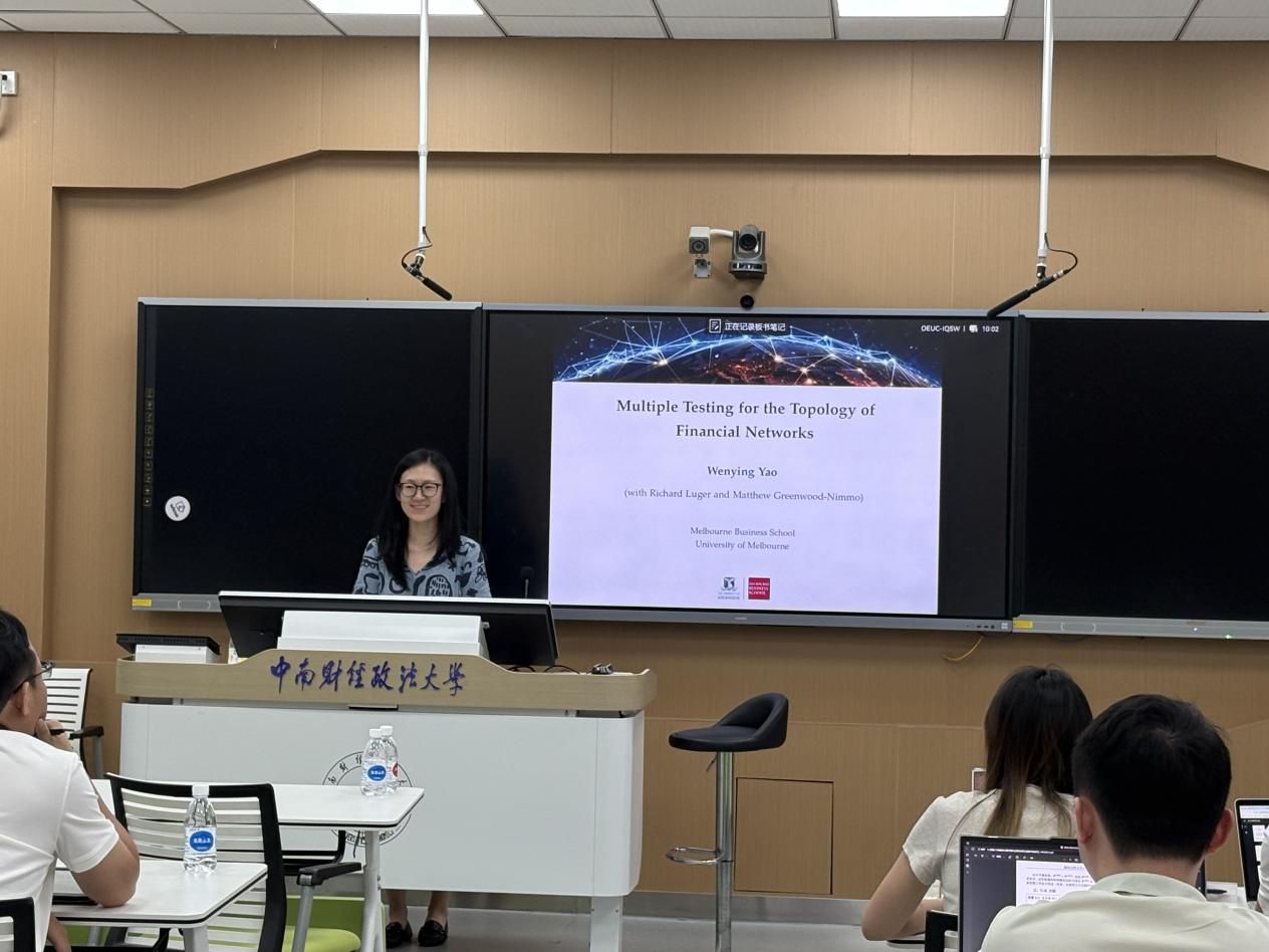 (通讯员 吴志伟 谭哲雨)6月17日10时,由统计与数学学院主办的“中南·统数”计量经济学系列讲座(2025年第5期)在文波楼205智慧教室成功举办。墨尔本大学姚文莹副教授应邀以“Multiple testing for the topology offinancial networks”为题做学术报告。本次讲座由统计与数学学院董朝华教授主持,学院师生积极参与。