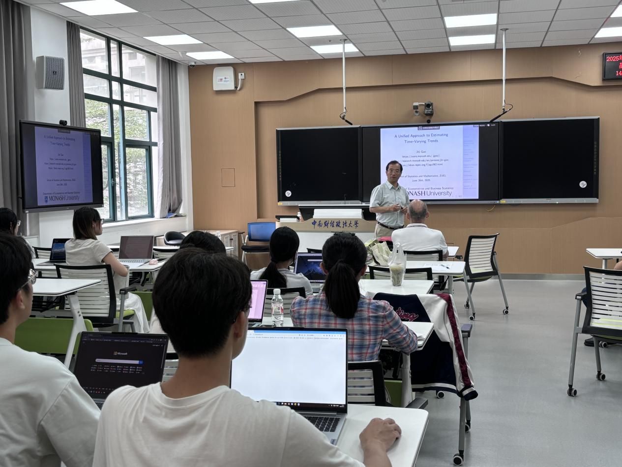 (通讯员 吴志伟 易菲亚)6月26日14时30分,由统计与数学学院主办的“中南·统数”求真创新论坛(2025年11期)学术报告在文波楼智慧教室205成功举办。本次讲座由莫纳什大学讲席教授高集体主讲,统计与数学学院董朝华教授主持,学院师生积极参与。