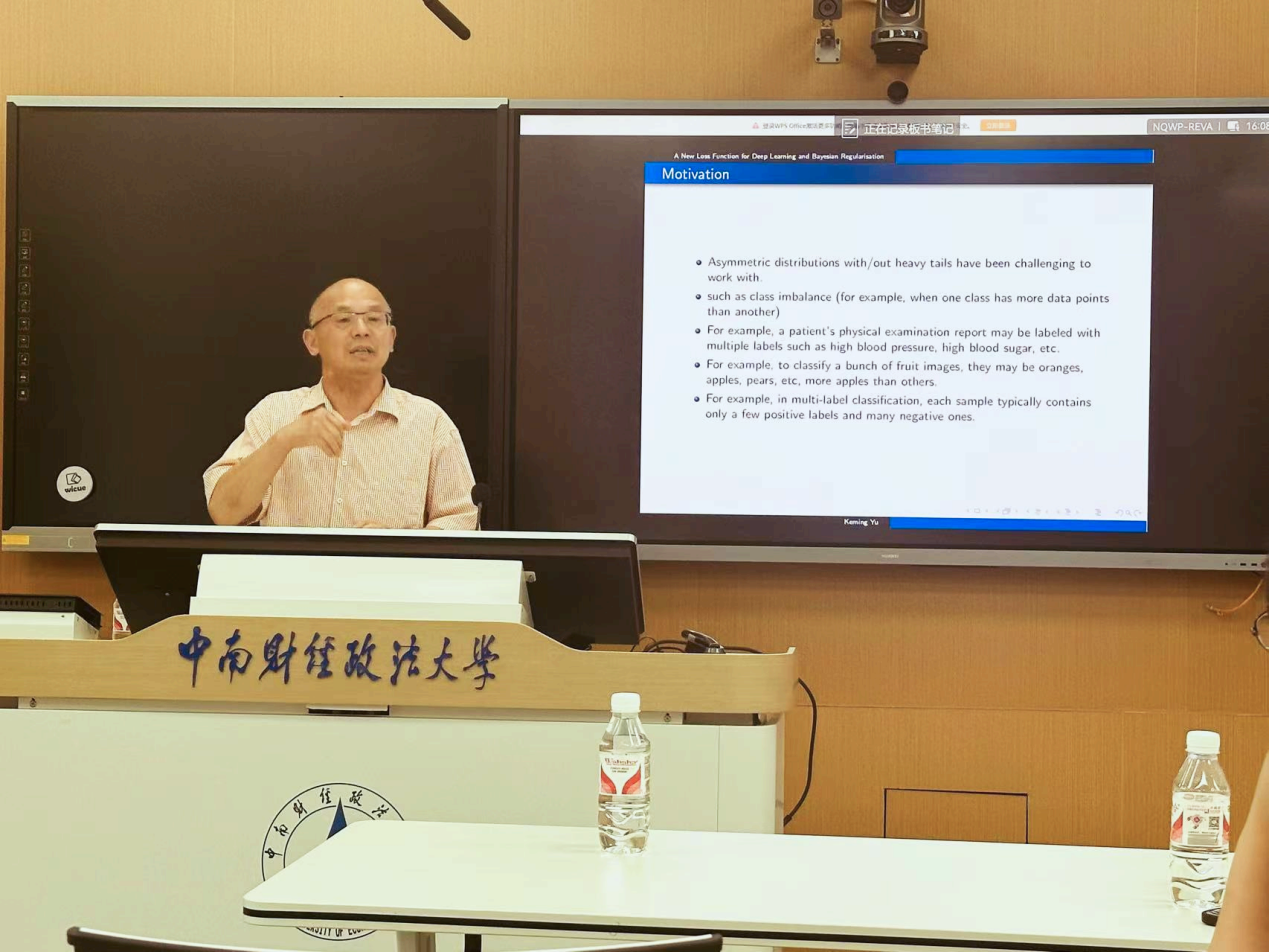 (通讯员 吴志伟 宋路遥)6月30日16点,由统计与数学学院主办的“中南·统数”数据科学系列讲座(2025年21期)在文波楼智慧教室205教室成功举办。伦敦布鲁内尔大学讲座教授虞克明受邀以“A New Loss Function for Deep Learning and Bayesian Regularisation”为题开展前沿学术分享,本期讲座由统计与数学学院李素芳教授主持,学院师生积极参与。