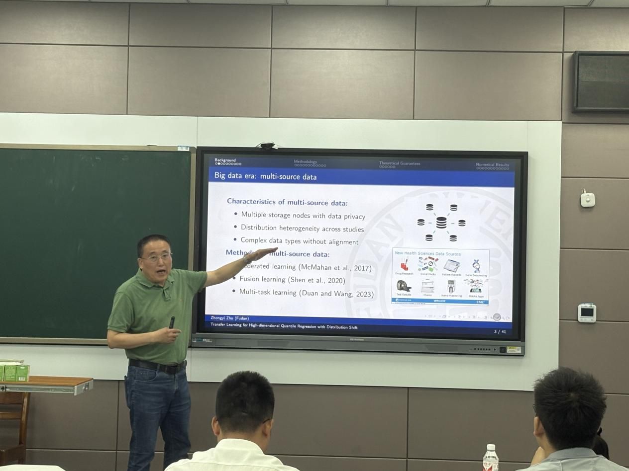 讲座中,朱教授首先指出当前知识转移研究中存在的核心挑战——目标研究与源研究间的分布偏移现象可能显著降低知识转移效率。针对这一关键问题,他重点阐释了参数偏移、协变量偏移、残差偏移三种典型分布偏移类型下的高维分位数回归理论,创新性地提出可转移集合及转移框架,有效破解了三类分布差异对知识转移的制约。在方法验证层面,朱教授通过建立非渐近估计误差界限与源检测一致性理论,严谨证明了该框架的有效性与优越性。值得关注的是,他进一步提出正交去偏方法应用于知识转移场景下的统计推断,成功实现渐近结果的精度提升,为高维统计推断提供了新的技术路径。