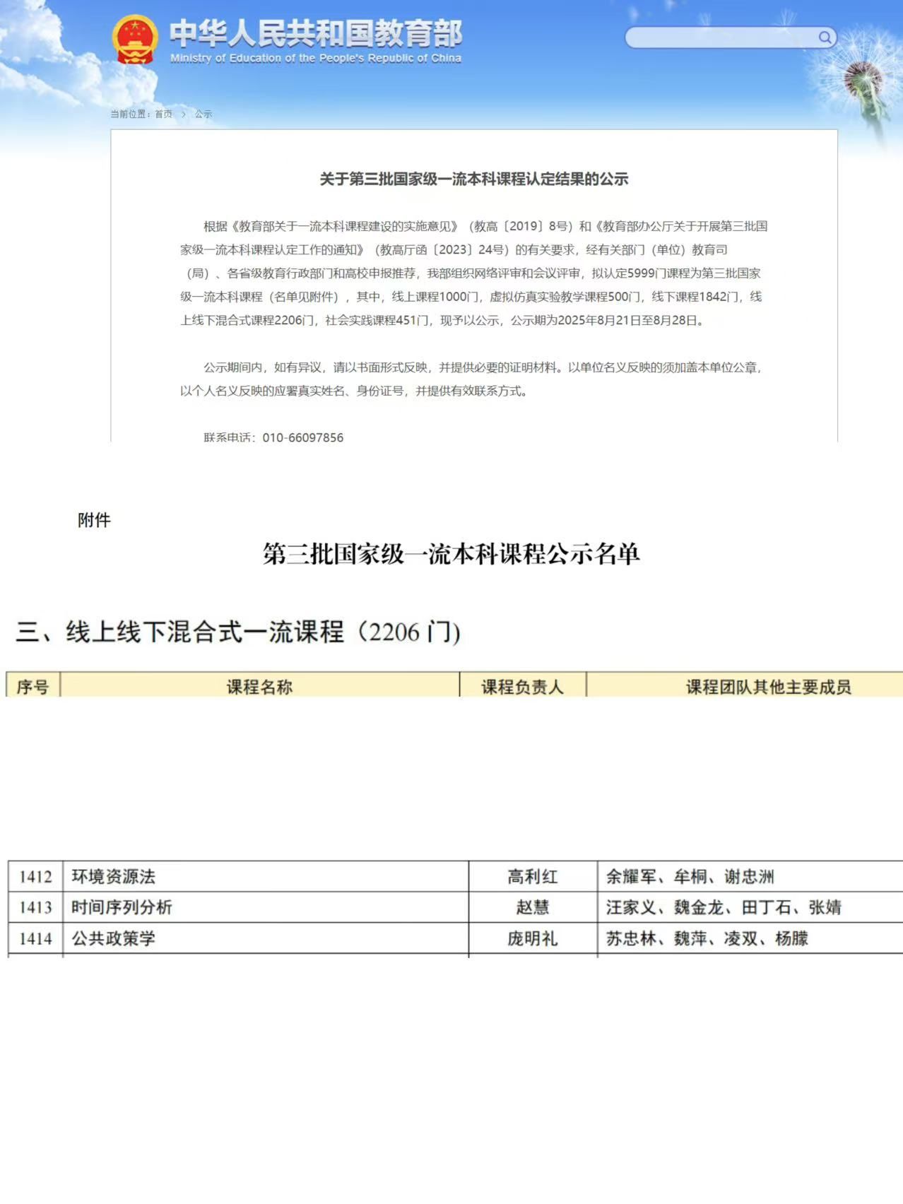 (通讯员:廖姗姗)近日,教育部高等教育司公示了第三批国家级一流本科课程认定结果,我院赵慧教授负责的《时间序列分析》课程获评为国家级线上线下混合式一流课程。