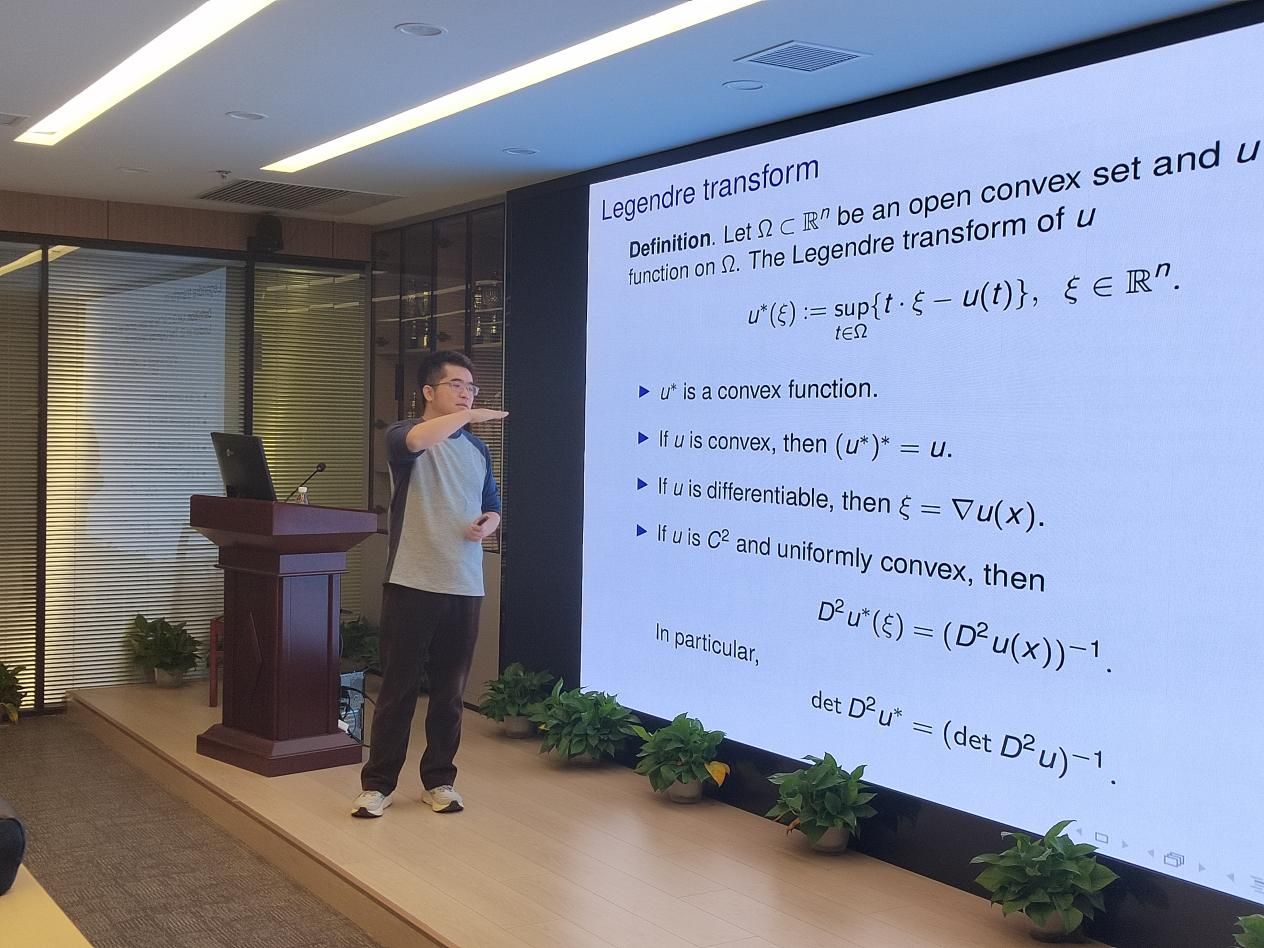 讲座系统阐述了Legendre变换及其推广形式——偏Legendre变换(PLT)的理论框架。以此为基础,引入了一类具有奇性或退化性的Monge-Ampère方程,探讨了其与Liouville定理、诺伊曼边值问题的内在联系,以及在线性化Monge-Ampère方程中的应用。针对四阶Monge-Ampère方程,报告重点介绍了Bernstein定理的新证明,环面上常标量曲率凯勒度量的构造,以及利用PLT证明边缘正则性的创新方法,最后将理论拓展至Grushin型退化方程的Hölder估计。