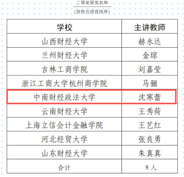 沈寒蕾将财经类院校学生学情融入中外文学经典电影及名著,授课逻辑结构清晰,教学内容充实,充分运用数字化教学手段调动学生参与热情,荣获全国二等奖。